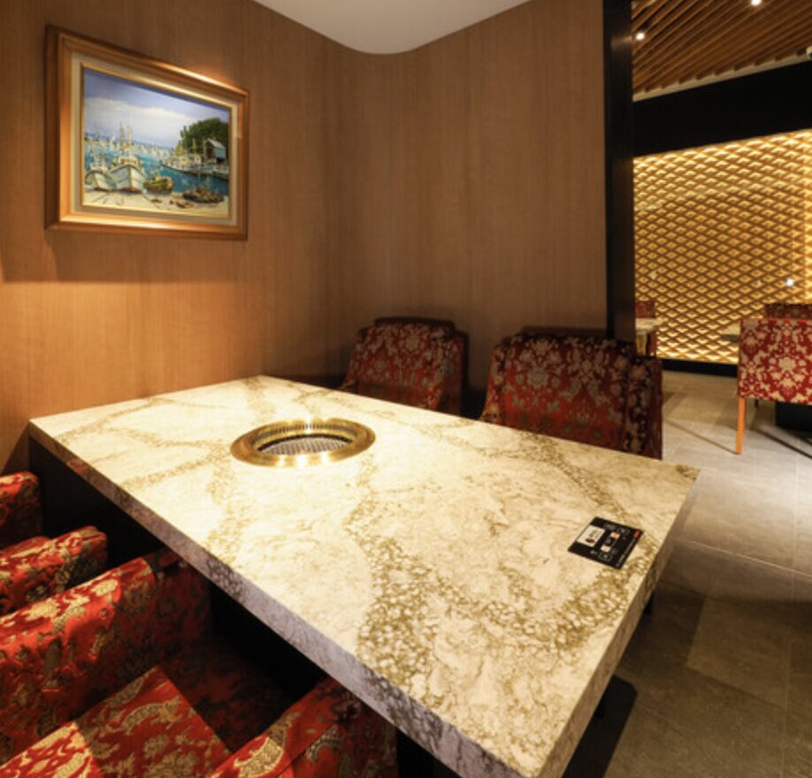ラグジュアリーな内装が非日常のひとときを演出。厳選されたA5ランクの雌牛を中心に、極上の焼肉をご提供。完全個室に加え、最大12名様対応の大広間も完備し、接待や記念日、会食に最適。