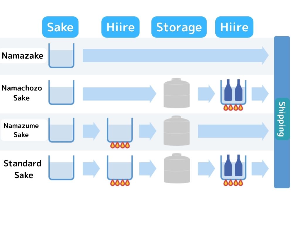 Have you ever seen terms like “Nama-zake(生酒),” “Nama-chozo-shu(生貯蔵酒),” or “Hiire(火入れ)” on sake labels?