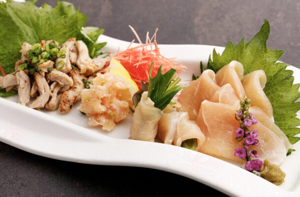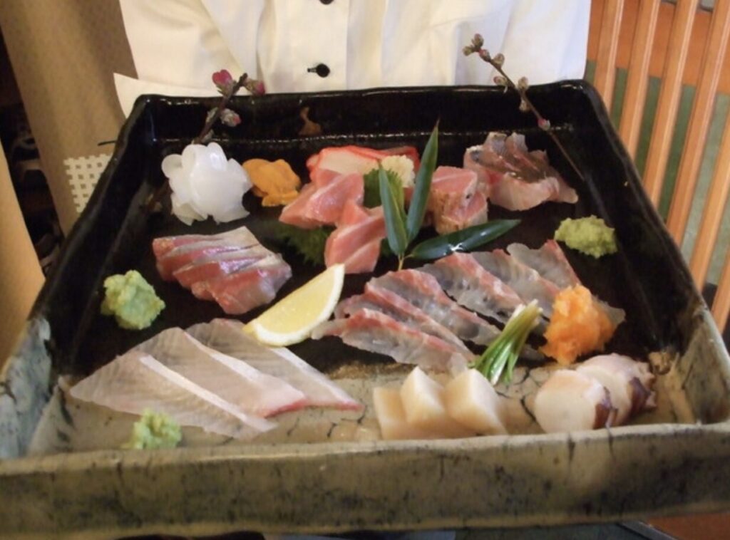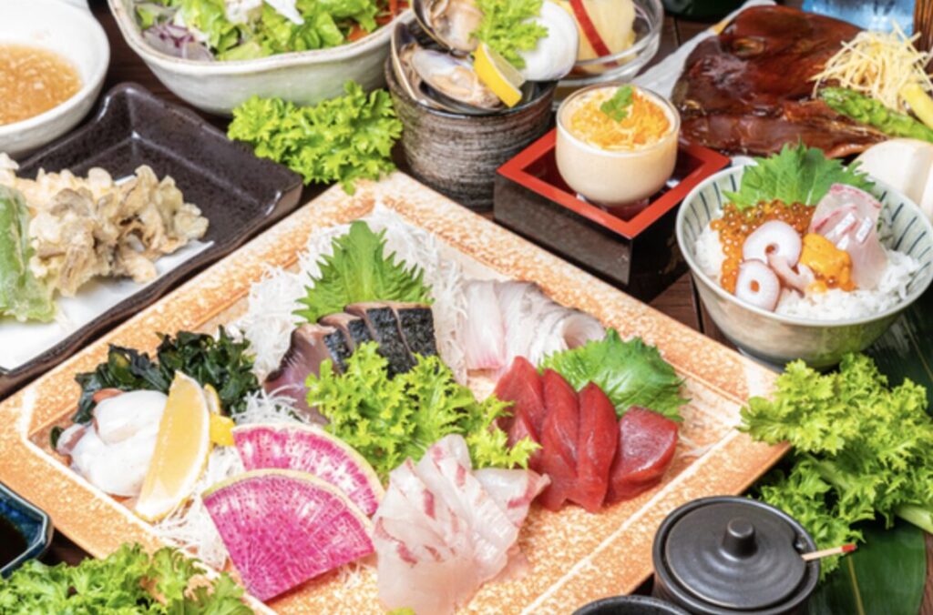 コース料理を頼むと、ゴマカンパチや新鮮なイカ刺し、香ばしい鶏焼きなど、九州らしさ満載の逸品が次々と登場!