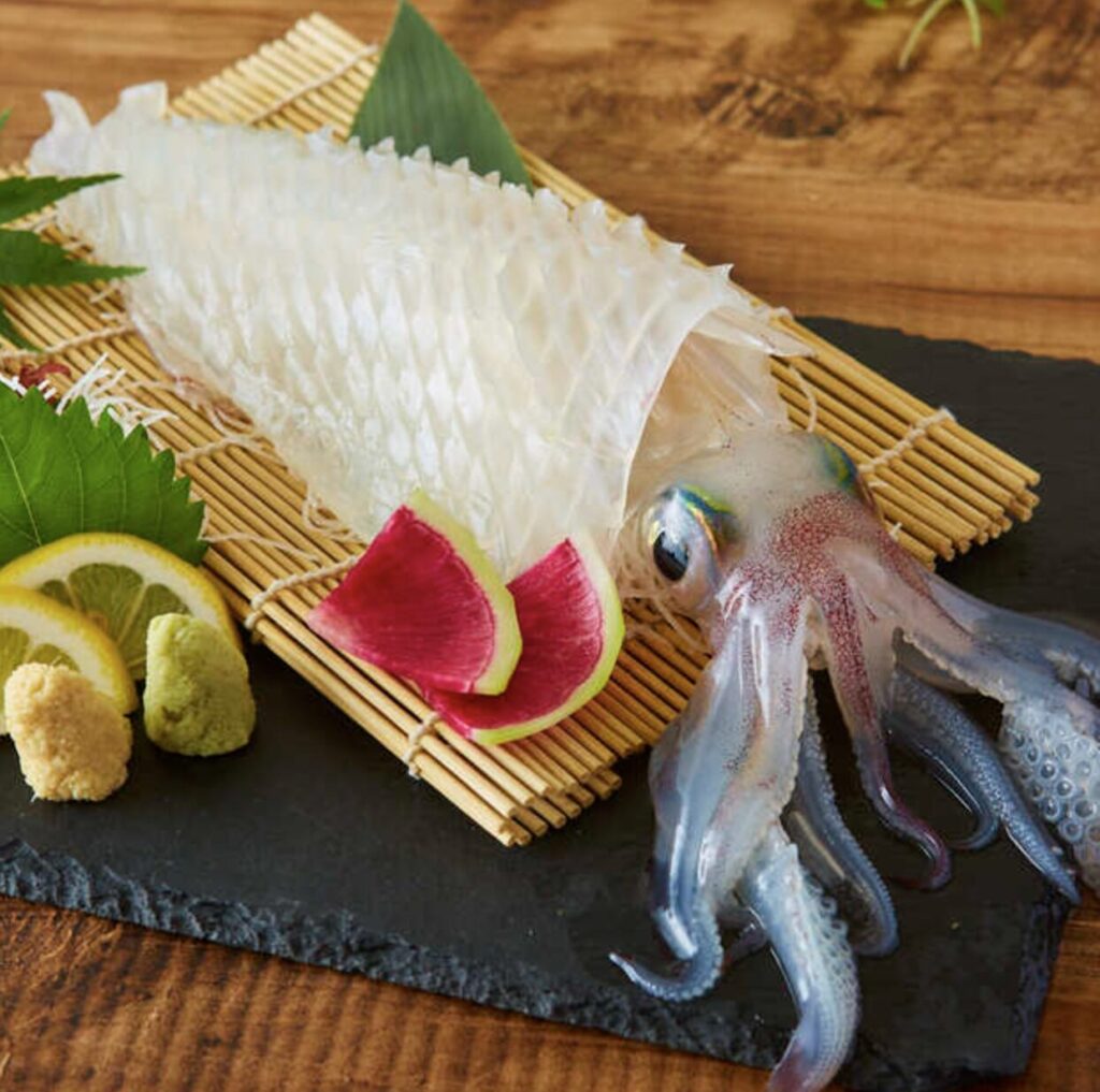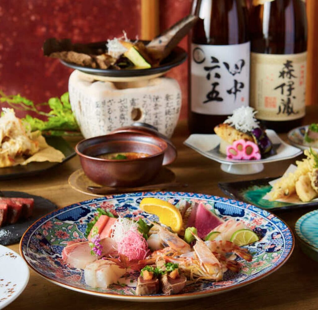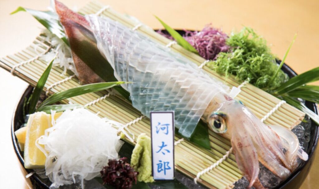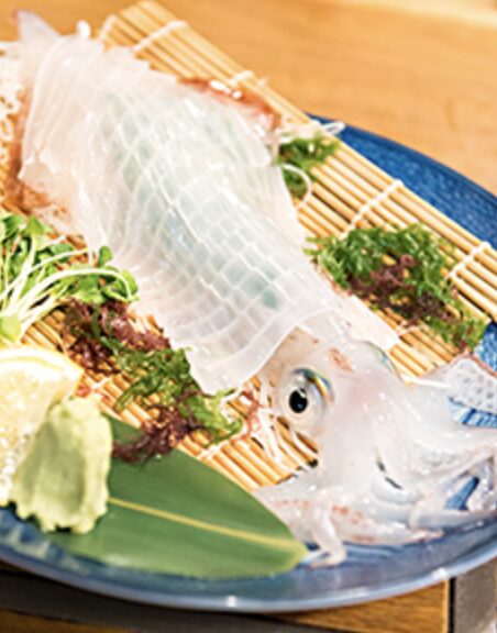 観光やビジネスに便利な博多駅前にありながら、中洲本店と変わらぬクオリティで「泳ぐイカの活き造り」を目の前でご提供。透明に輝く新鮮なイカの甘みと食感は感動もの。さらに、九州各地から厳選した旬の食材をふんだんに使った料理を豊富にご用意。