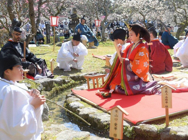 例えば、福岡県の太宰府天満宮や京都の城南宮では、毎年曲水の宴が開催され、参加者は和歌を詠み、盃を受け取りながら日本酒を楽しむ光景が広がります。